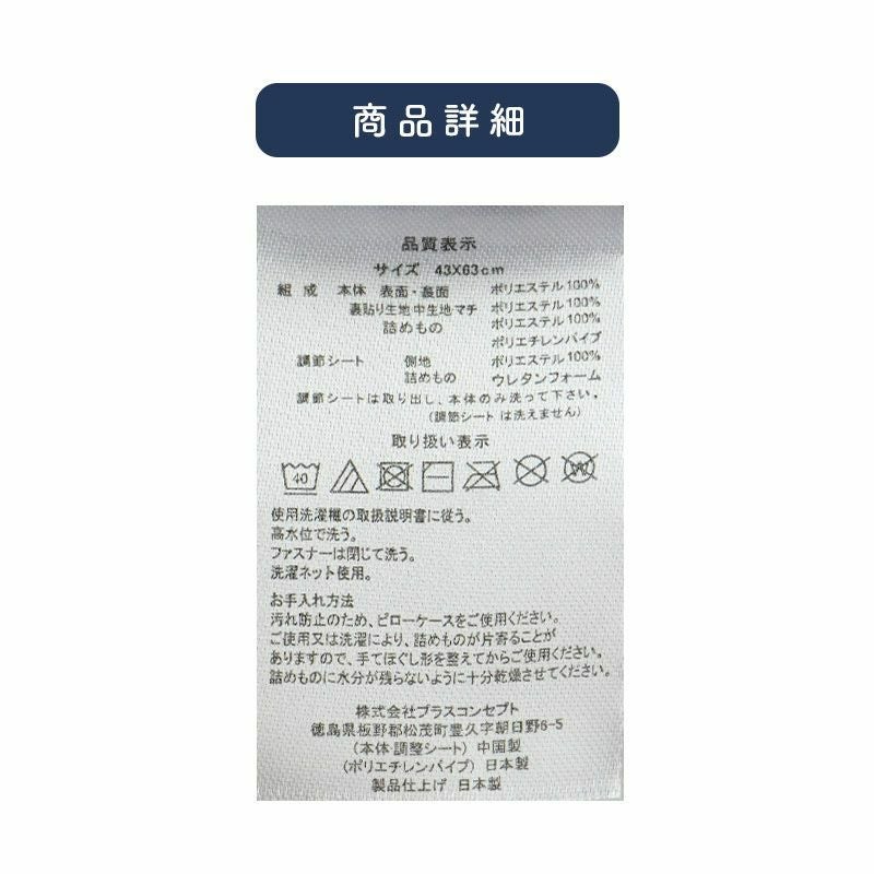 商品タグ記載サイズは「約43×63cm」です。メジャーで測ったおおよそのサイズは約38×60cmとなっておりますが、個体差により誤差がございます。高さは後頭部のくぼみ部分が約8cm、そのすぐ下の首筋が約9cm、横は後頭部近くが約9.5cm、肩近くは約10cmです。ピロケースは43×63サイズをご使用ください。