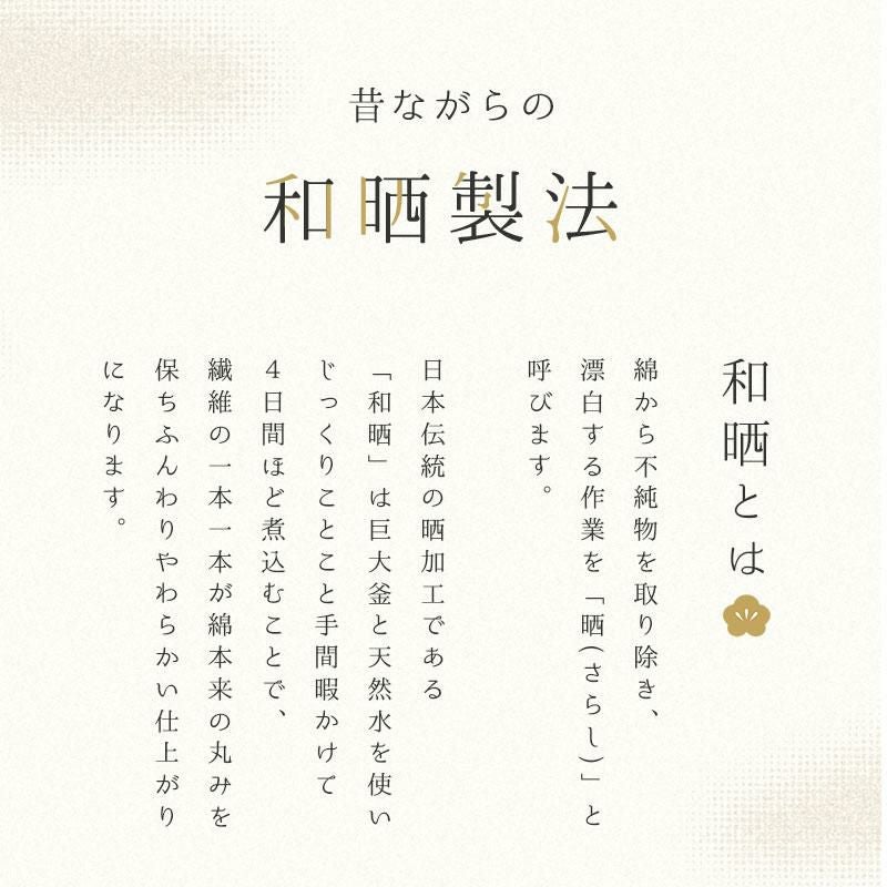 綿から不純物を取り除き、漂白する作業を「晒(さらし)」と呼びます。日本伝統の晒加工である「和晒」は、巨大釜と天然水を使い、手間暇かけてじっくり4日間煮込むことで、繊維の一本一本が綿本来の丸みを保ち、ふんわりやわらかい仕上がりになります。