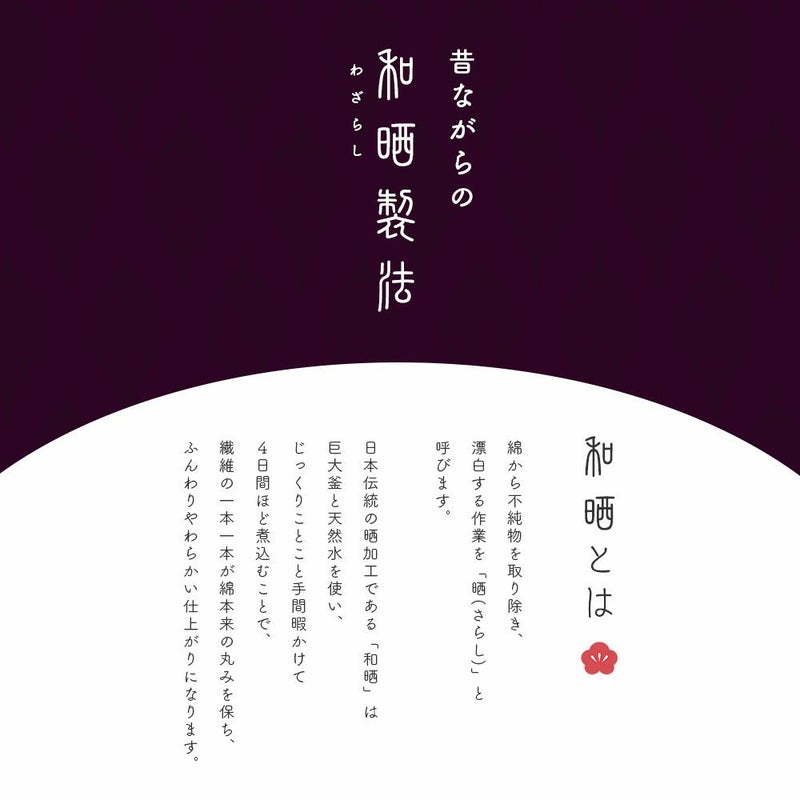 綿から不純物を取り除き、漂白する作業を「晒(さらし)」と呼びます。日本伝統の晒加工である「和晒」は、巨大釜と天然水を使い、手間暇かけてじっくり4日間煮込むことで、繊維の一本一本が綿本来の丸みを保ち、ふんわりやわらかい仕上がりになります。