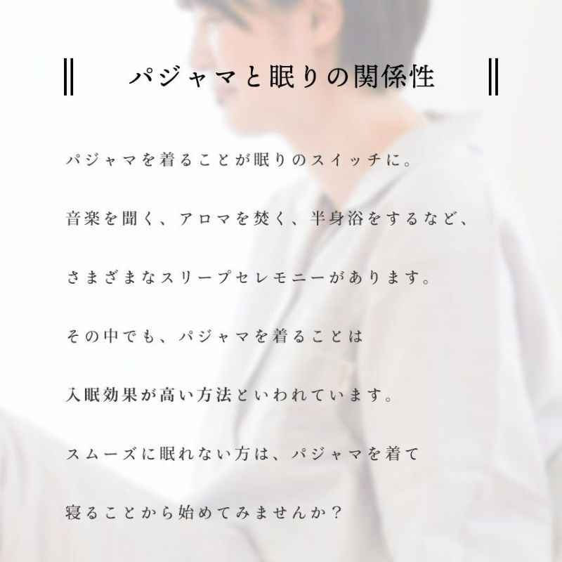 パジャマを着ることが眠りのスイッチに。音楽を聞く、アロマを焚く、半身浴をするなど、 さまざまなスリープセレモニーがあります。その中でも、パジャマを着ることは 入眠効果が高い方法といわれています。スムーズに眠れない方は、パジャマを着て 寝ることから初めてみませんか?