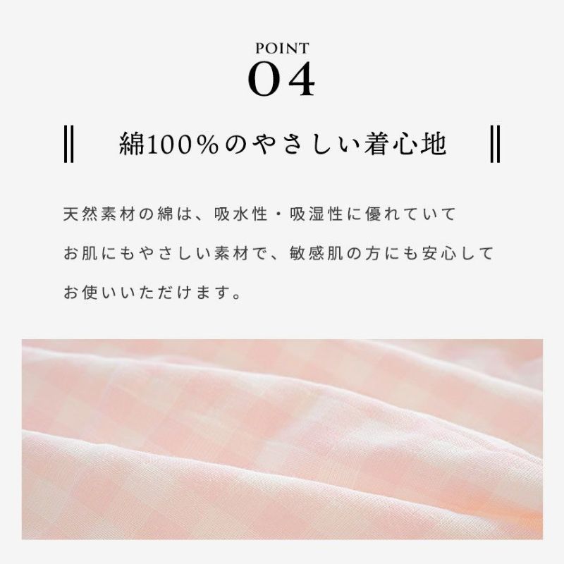 肌あたり…ソフトで肌触りが良く軽い着心地の無撚糸2重ガーゼ。 動きやすさ…縫い目にこだわることで寝返り時などの不快感を軽減。 温度・湿度…汗を吸収し衣服内の温度と湿度を快適に整える綿100%。