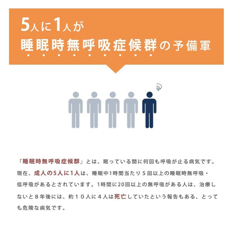 • この商品は医療器具ではありません。また、病気を治療するものでもありません。睡眠時無呼吸症候群、あるいはその疑いのある方は、ご使用前に専門医にご相談ください。
