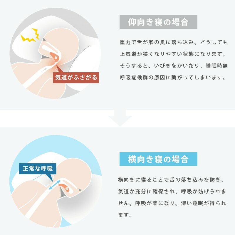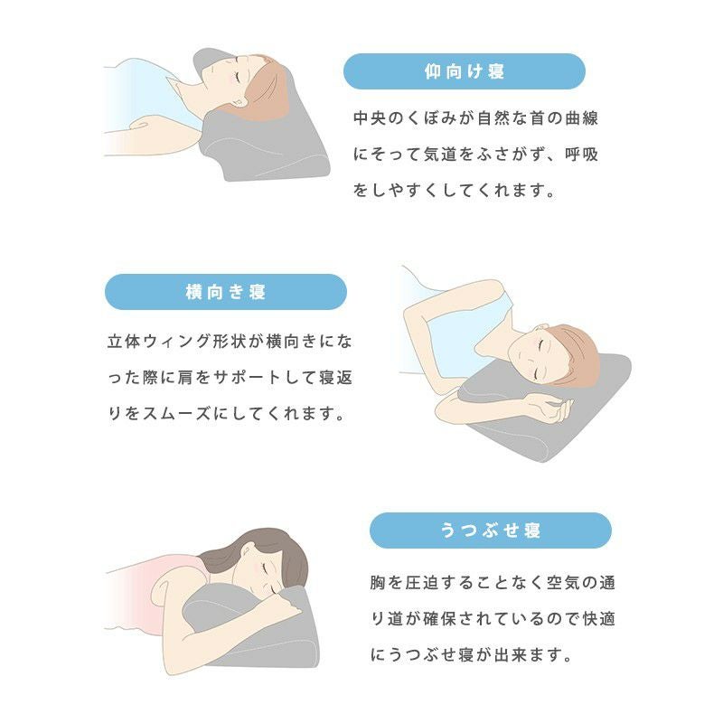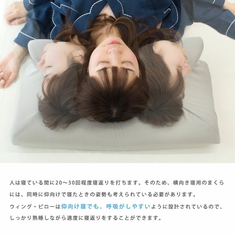 人は寝ている間に20~30回程度寝返りを打ちます。そのため、横向き寝用の枕には、同時に仰向けで寝たときの姿勢も考えられている必要があります。寝姿勢がいかに良くとも、その状態で寝返りができないと、身体の同じ箇所に絶えず圧力がかかっているので、血行が悪くなり、逆に身体の痛みや起きたときの疲労に繋がります。ウイングピローは仰向け寝でも、呼吸がしやすいように設計されているので、しっかり熟睡しながら適度に寝返りをすることができます。