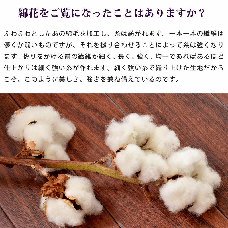 ふわふわとしたあの綿毛を加工し、糸を紡ぎます。一本一本の繊維は儚くか弱いものですが、それを撚り合わせることによって糸は強くなります。 撚りをかける前の繊維が細く、長く、強く、均一であればあるほど仕上がりは細く強い糸が作れます。 細く強い糸で織り上げた生地だからこそ、このように美しさ、強さを兼ね備えているのです。