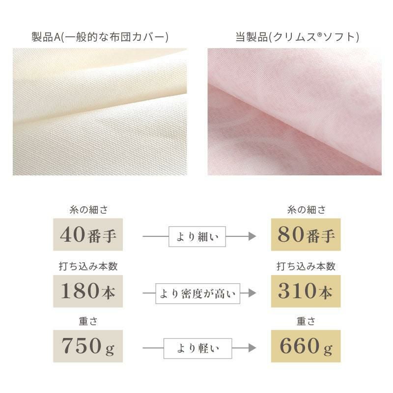 羽毛は寒くなると羽枝を伸ばして空気を取り込み、ふわふわと膨らんで暖かな空気を溜め込みます。せっかく良い羽毛布団を選んでも、布団を包むカバーが重たく通気性のないものだと、羽毛の心地よさを充分に引き出すことができません。スペックの高い羽毛布団ほど、その保温力と心地よさを充分に引き出すために、品質の高いカバー選びが大切です。