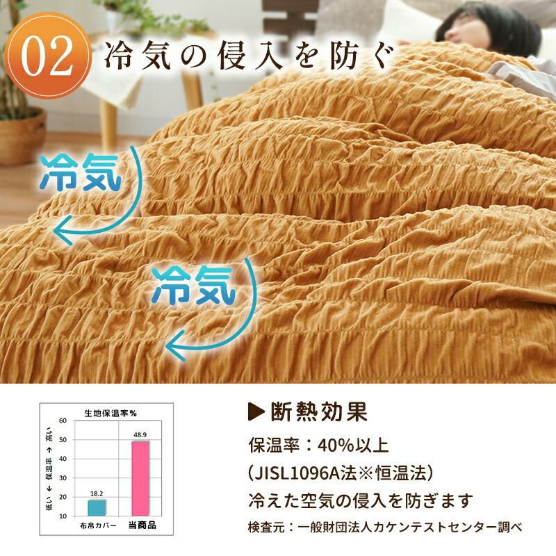 保温率:40%以上(JISL1096A法※恒温法)。 冷えた空気の侵入を防ぎます。