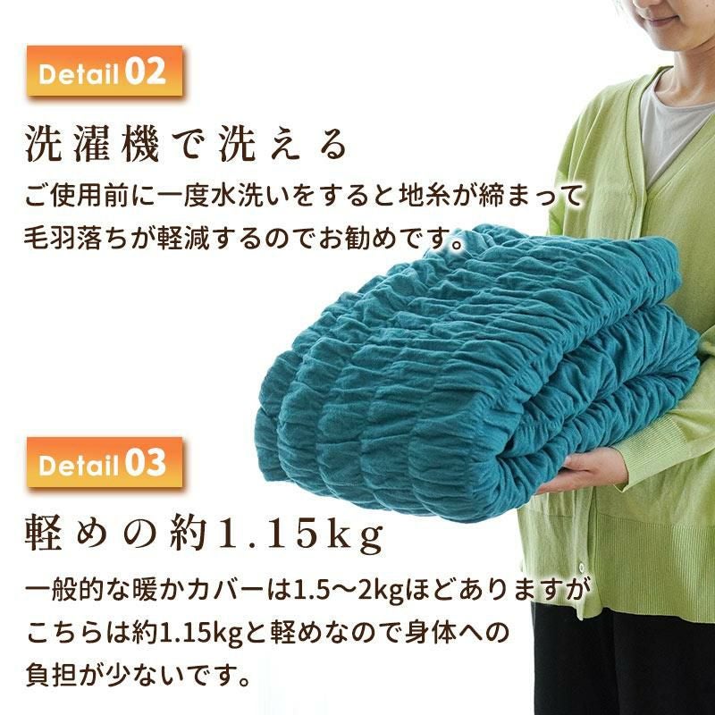 一般的な暖かカバーは1.5~2kgほどありますがこちらは約1.15kgと軽めなので身体への負担が少ないです。