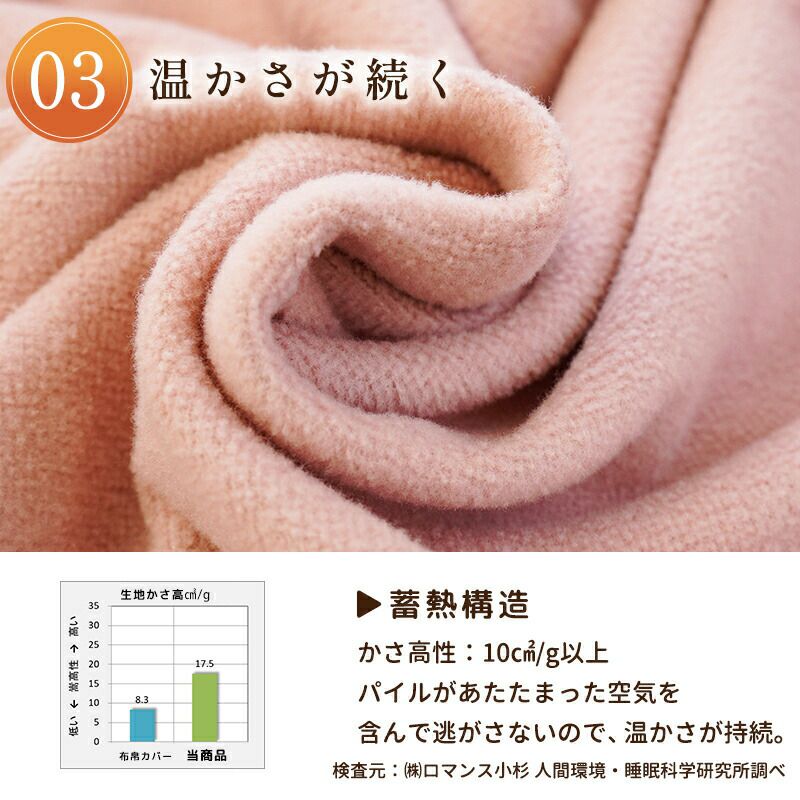 かさ高性:10cm3/g以上。パイルがあたたまった空気を含んで逃がさないので、温かさが持続。