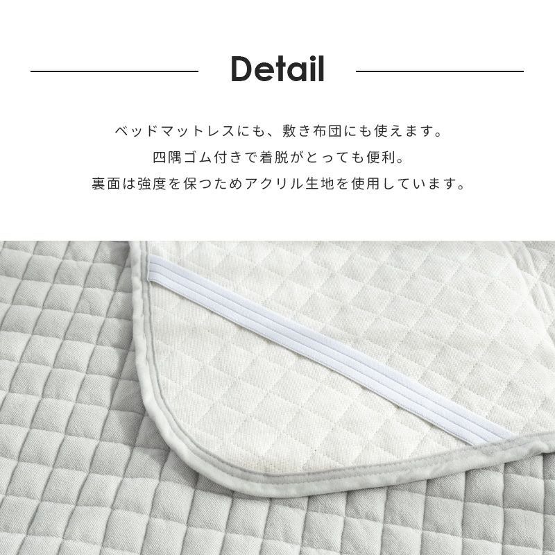裏面四隅ゴム付きで着脱もラクラク!ベッドマットレス、敷き布団のどちらにもお使いいただけます。