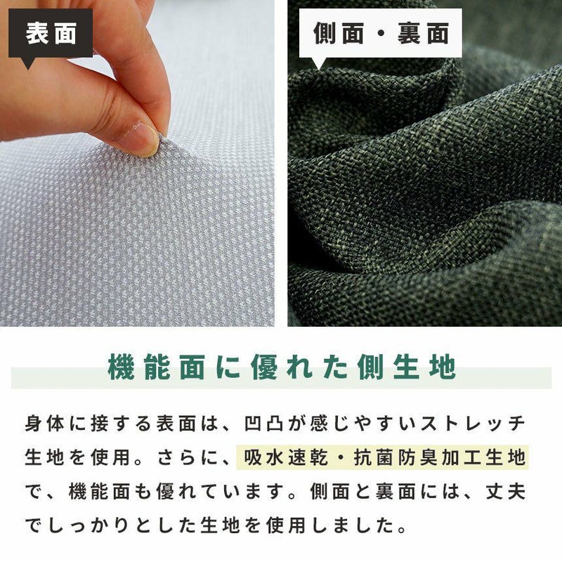 表面側地は吸水速乾・抗菌防臭加工ストレッチ生地を採用。側面・裏面には、丈夫でしっかりとした生地を使用しました。L字ファスナーで中材を取り出し、側地のみお洗濯OK!