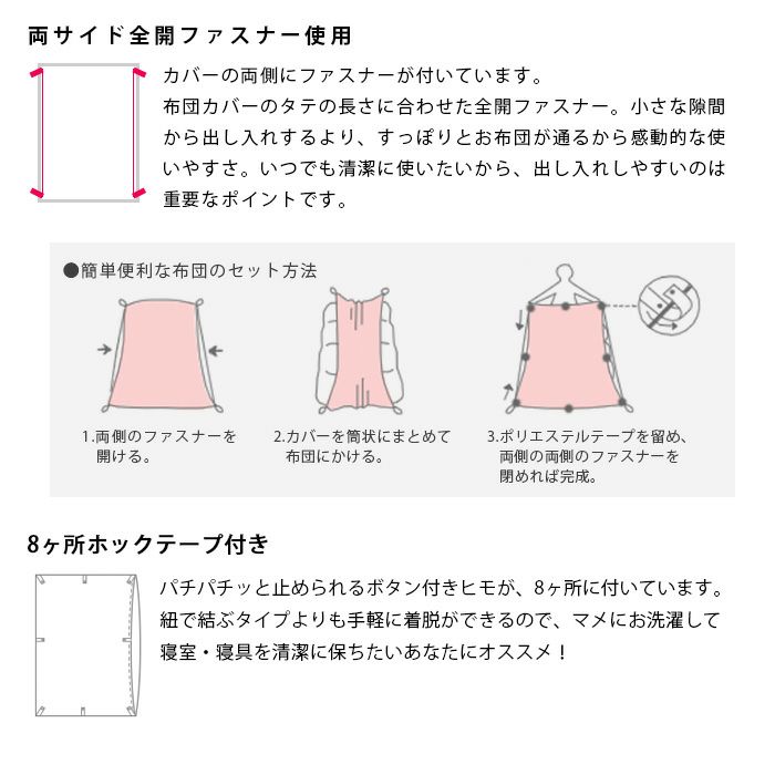 カバーの両側にファスナーが付いています。両サイドがオープンするので、布団の出し入れが簡単に。