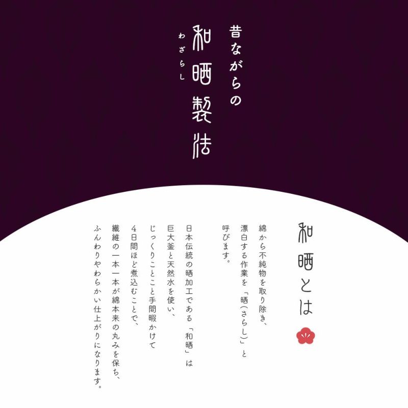綿から不純物を取り除き、漂白する作業を「晒(さらし)」と呼びます。日本伝統の晒加工である「和晒」は、巨大釜と天然水を使い、手間暇かけてじっくり4日間煮込むことで、繊維の一本一本が綿本来の丸みを保ち、ふんわりやわらかい仕上がりになります。