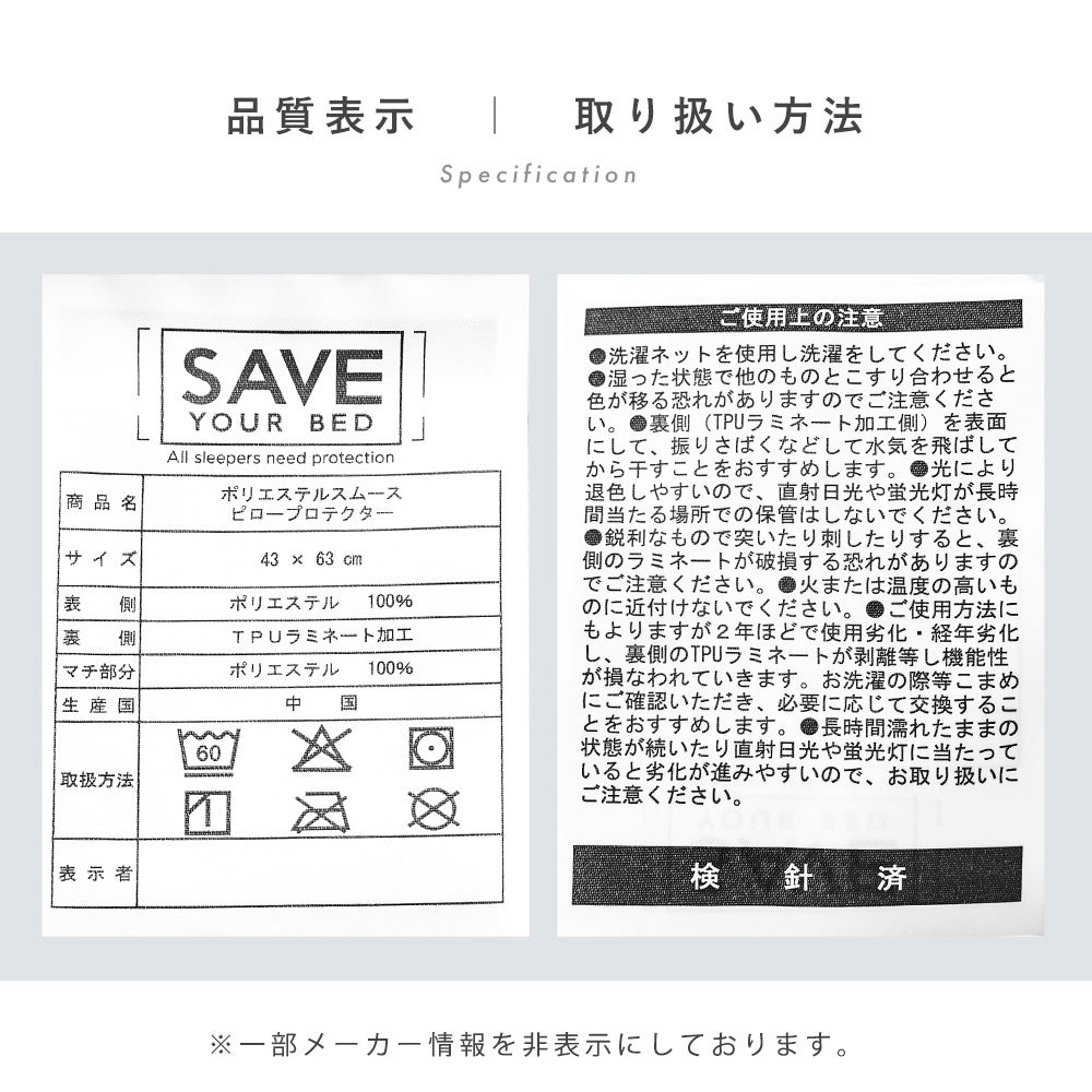 5. 枕カバー SAVE YOUR BED ピロープロテクター クラシック 43×63cm 洗える 防水 防ダニ ファスナー 無地 ホワイト