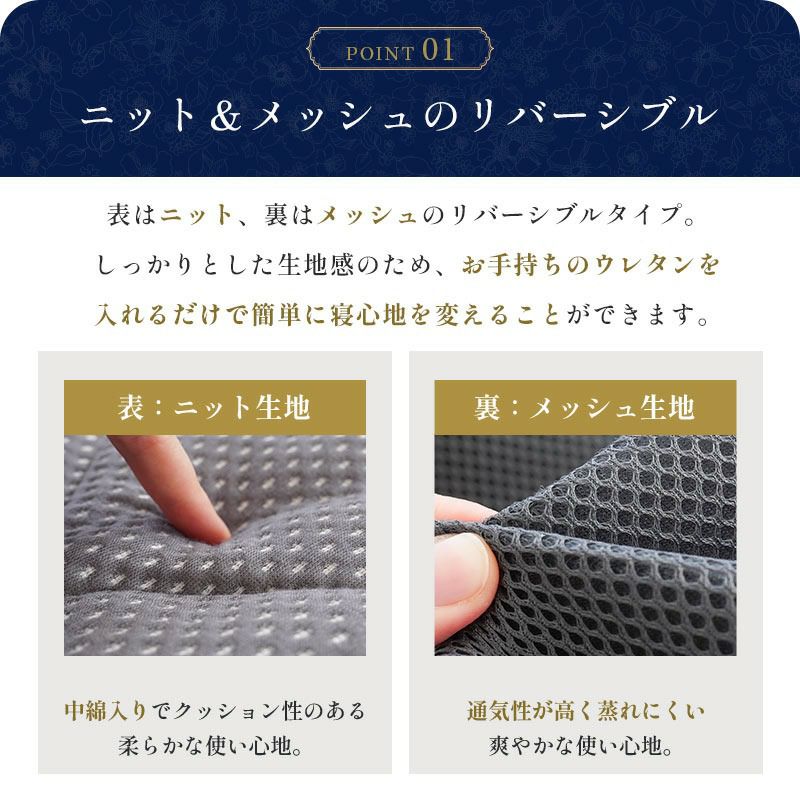 表は中綿入りでクッション性のある柔らかな使い心地のニット、裏は通気性が高く蒸れにくい爽やかな使い心地のメッシュのリバーシブルタイプ。しっかりとした生地感のため、お手持ちのウレタンを入れるだけで簡単に寝心地を変えることができます。