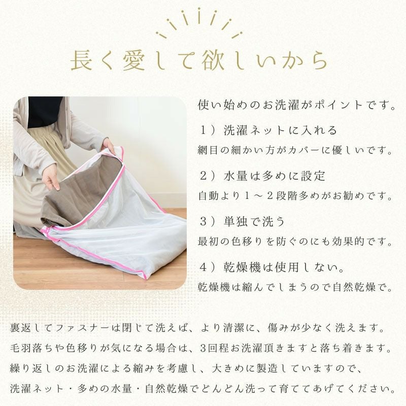 あたたかいお布団とは、身体にしっかりとフィットし、かつ身体に負担を掛けない軽さが重要です。せっかくの軽い羽毛布団でも、重くて固いカバーを掛けてしまうと羽毛が上から押さえつけられて羽毛布団の機能が十分に発揮できません。羽毛布団のキルトにやわらかく寄り添い、ふわりと軽く丈夫なガーゼは、まさに羽毛布団にぴったりのカバーです。