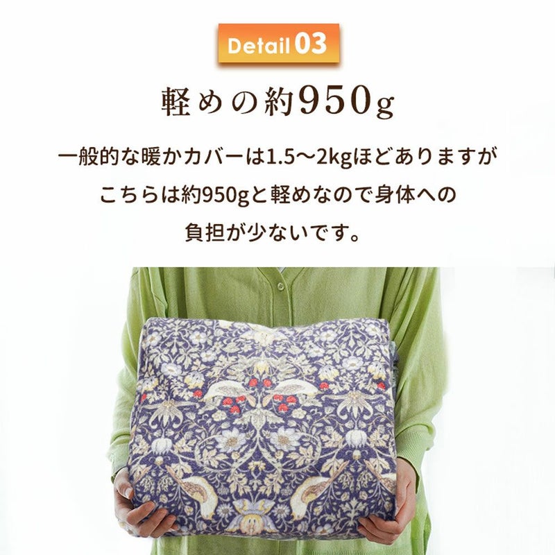 一般的な暖かカバーは1.5〜2kgほどありますがこちらは約950gと軽めなので身体への負担が少ないです。