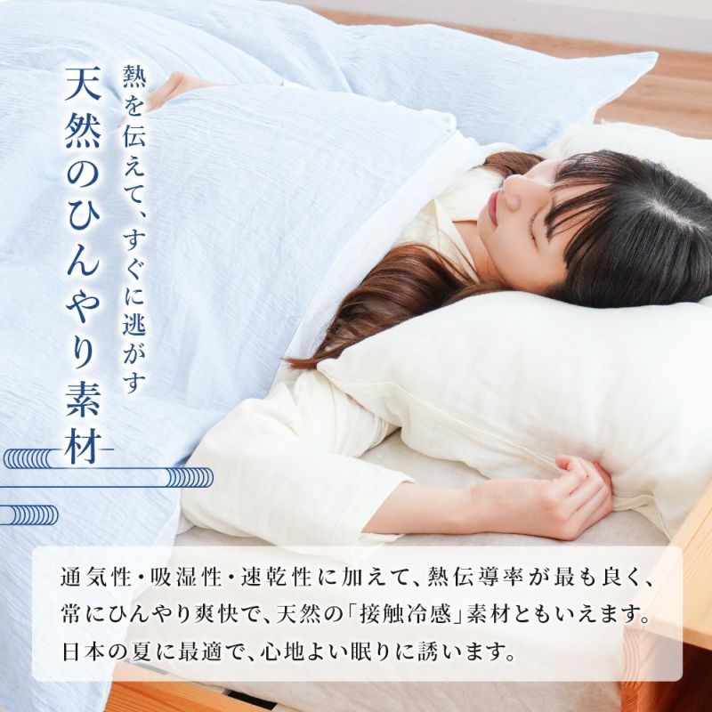 通気性・吸湿性・速乾性に加えて、熱伝導率が最も良く、常にひんやり爽快で、天然の「接触冷感」素材ともいえます。日本の夏に最適で、心地よい眠りに誘います。