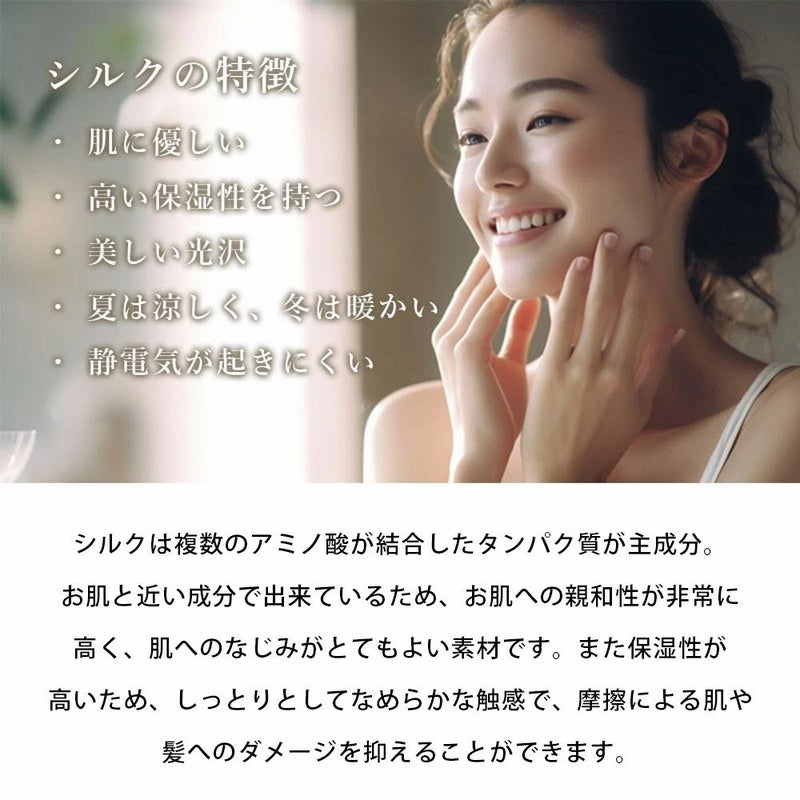 シルクは複数のアミノ酸が結合したタンパク質が主成分。お肌と近い成分で出来ているため、お肌への親和性が非常に高く、肌へのなじみがとてもよい素材です。また保湿性が高いため、しっとりとしてなめらかな触感で、摩擦による肌や髪へのダメージを抑えることができます。