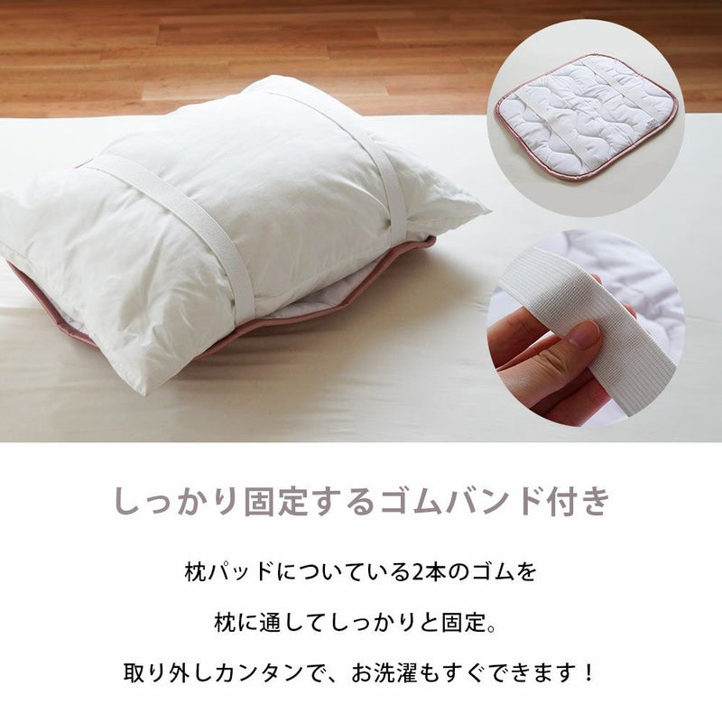 枕パッドについている2本のゴムを枕に通してしっかりと固定。取り外しカンタンで、お洗濯もすぐできます!