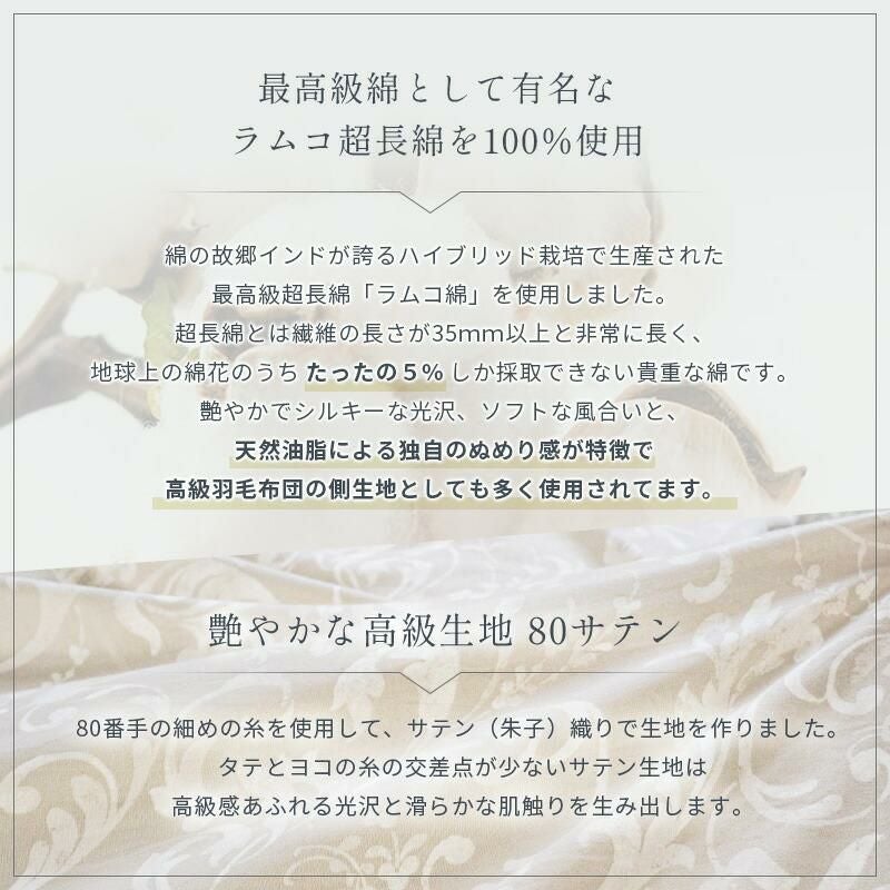 綿の故郷インドが誇るハイブリッド栽培で生産された最高級超長綿「ラムコ綿」を使用しました。超長綿とは繊維の長さが35mm以上と非常に長く、地球上の綿花のうちたったの5%しか採取できない貴重な綿です。 艶やかでシルキーな光沢、ソフトな風合いと、天然油脂による独自のぬめり感が特徴で、高級羽毛布団の側生地としても多く使用されてます。