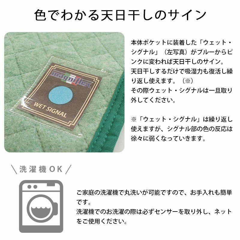 本体ポケットに装着した「ウェット・シグナル」がブルーからピンクに変われば天日干しのサイン。天日干しするだけで吸湿力も復活し繰り返し使えます。 お洗濯の際は必ずセンサーを外し、洗濯ネットをご使用ください。