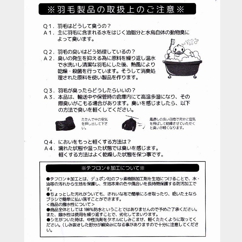 羽毛布団は天然素材の為、無臭ではありません。特に開梱直後や、温度・湿度の関係で臭いが強く感じられる場合もございます。その場合は、羽毛布団に空気を含ませるように数回揺らし、布団内の空気をゆっくり追い出してください。