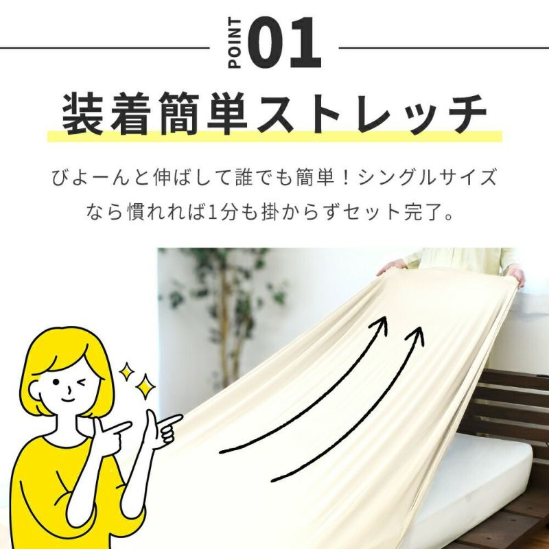 びよーんと伸ばして誰でも簡単に装着出来ます。シングルのサイズなら慣れれば1分もかからずにセット完了!伸ばすだけでピッタリフィットしてアイロンせずともシワ1つないうっとりするベッドメイクが完成します。