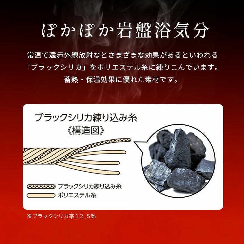 岩盤浴面には、常温で遠赤外線放射などさまざまな効果があるといわれる天然鉱石「ブラックシリカ」をポリエステル糸に練り込んでいるため、蓄熱・保温効果に優れています。