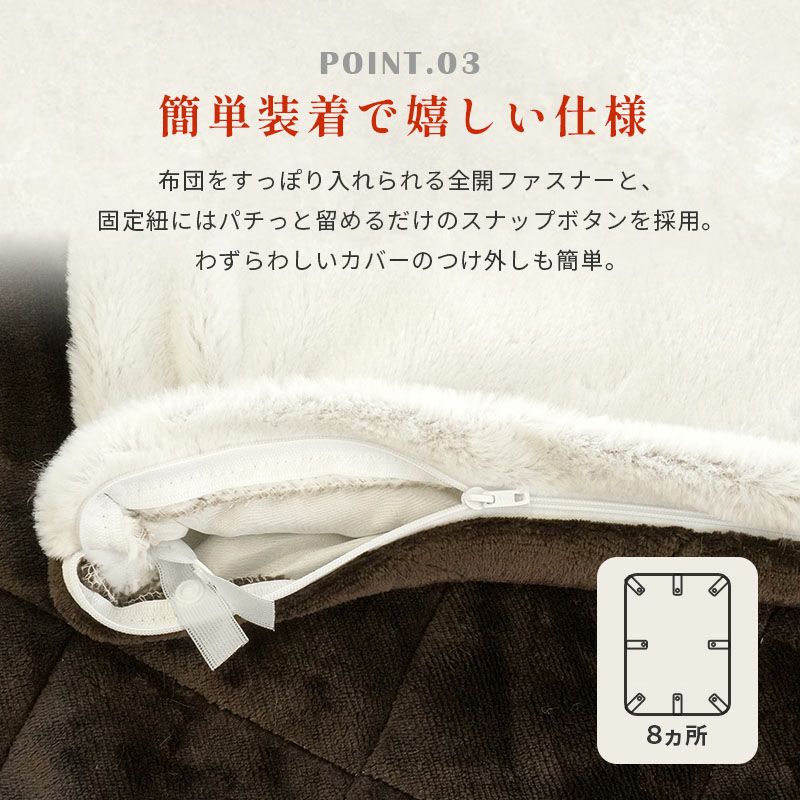 中にお布団を入れてさらに暖かさUP!カバー内側にはお布団を固定するためのスナップボタン紐が8ヶ所に付いているので、ワンタッチでズレにくい。
