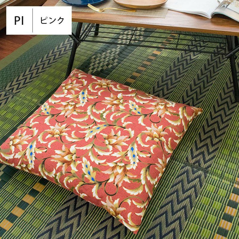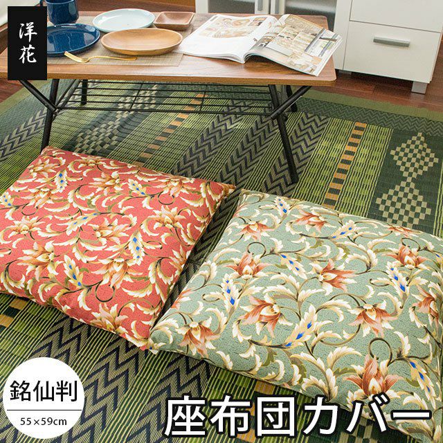 銘仙判、55×59cmサイズ用の座布団カバー。洋風な花がらをあしらったモダンデザイン。綿100%生地を使用。イメージチェンジ、汚れ防止に活躍します。