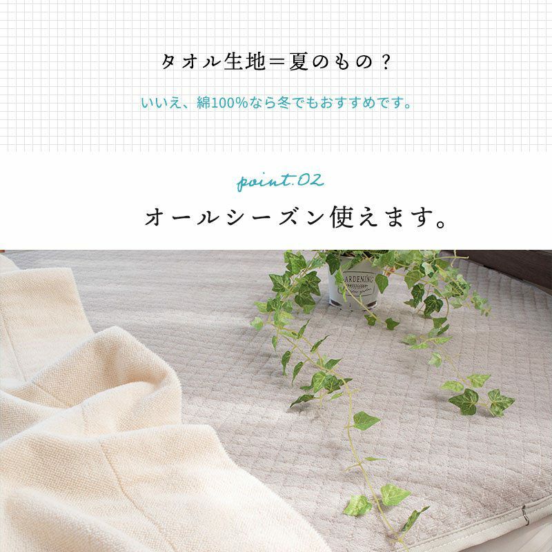 春夏は汗取り敷きパッドに、秋冬はヒヤッとしにくくやわらかな寝心地、オールシーズンお使いいただけます。