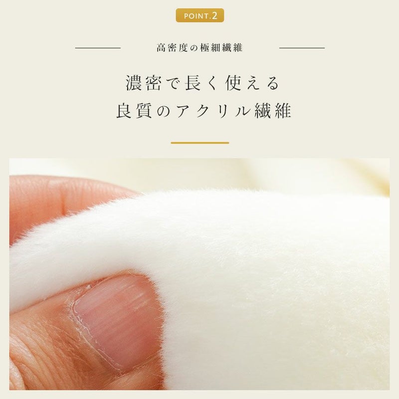 上質なアクリル繊維は糸が細くやわらか。さらに毛の密度が高いほど、保温性・耐久性・ボリューム感がアップし、もっちり柔らかく暖かくなります。
