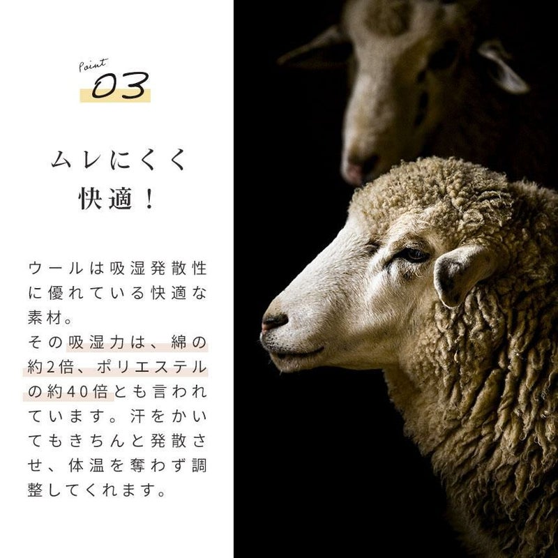 ウールは吸湿発散性に優れている快適な素材。その吸湿力は、綿の約2倍、ポリエステルの約40倍とも言われています。汗をかいてもきちんと発散させ、体温を奪わず調整してくれます。