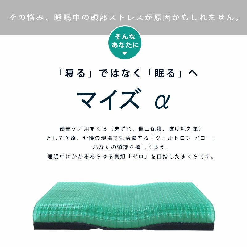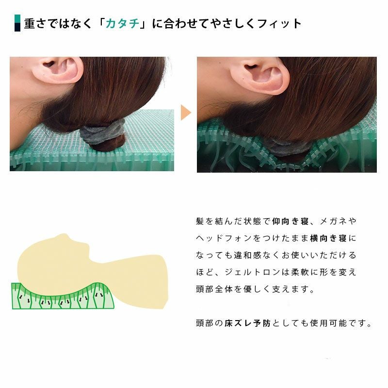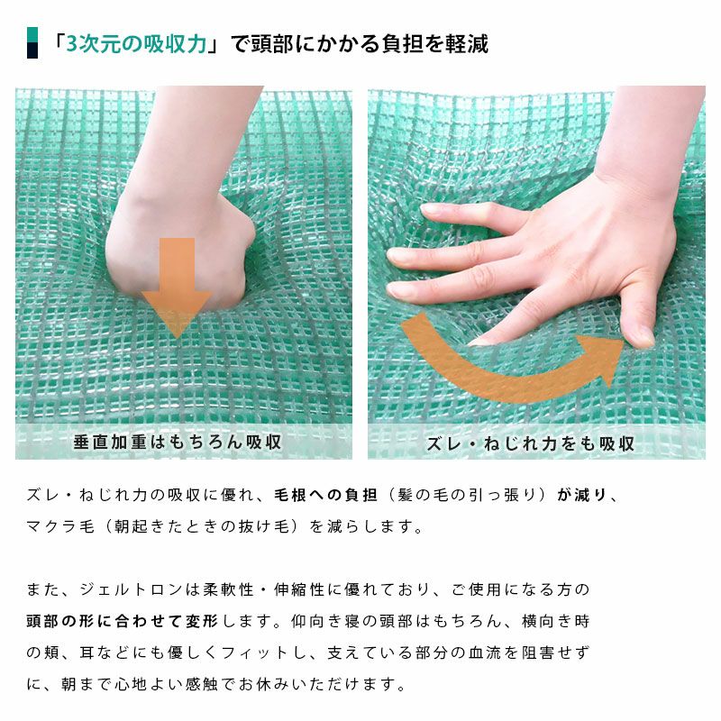 ズレ・ねじれ力の吸収に優れ、毛根への負担(髪の毛の引っ張り)が減り、 マクラ毛(朝起きたときの抜け毛)を減らします。 また、ジェルトロンは柔軟性・伸縮性に優れており、ご使用になる方の 頭部の形に合わせて変形します。仰向き寝の頭部はもちろん、横向き時 の頬、耳などにも優しくフィットし、支えている部分の血流を阻害せず に、朝まで心地よい感触でお休みいただけます。