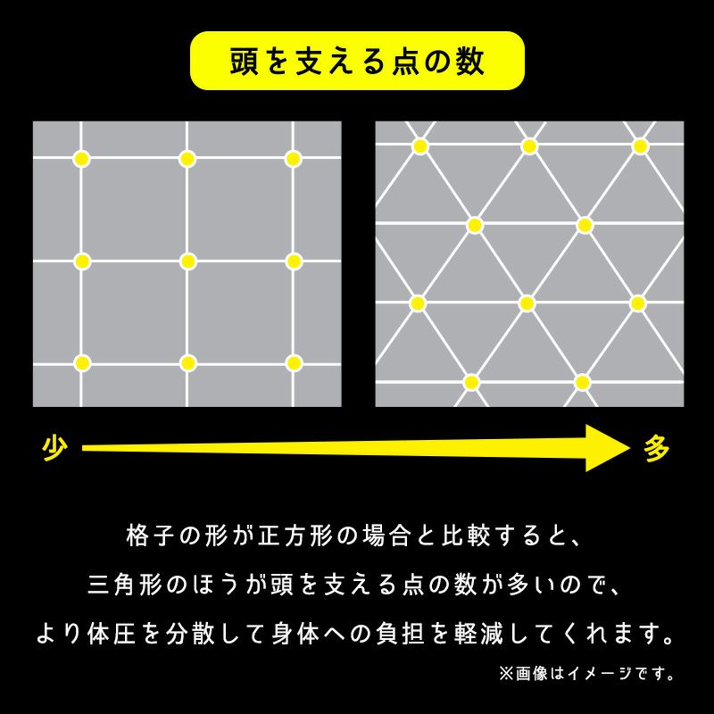 人間工学に基づく三角格子構造で効果的に圧力を分散。体圧を分散する上層部と頭を支えるベース部の2層構造で快適な睡眠をサポートします。