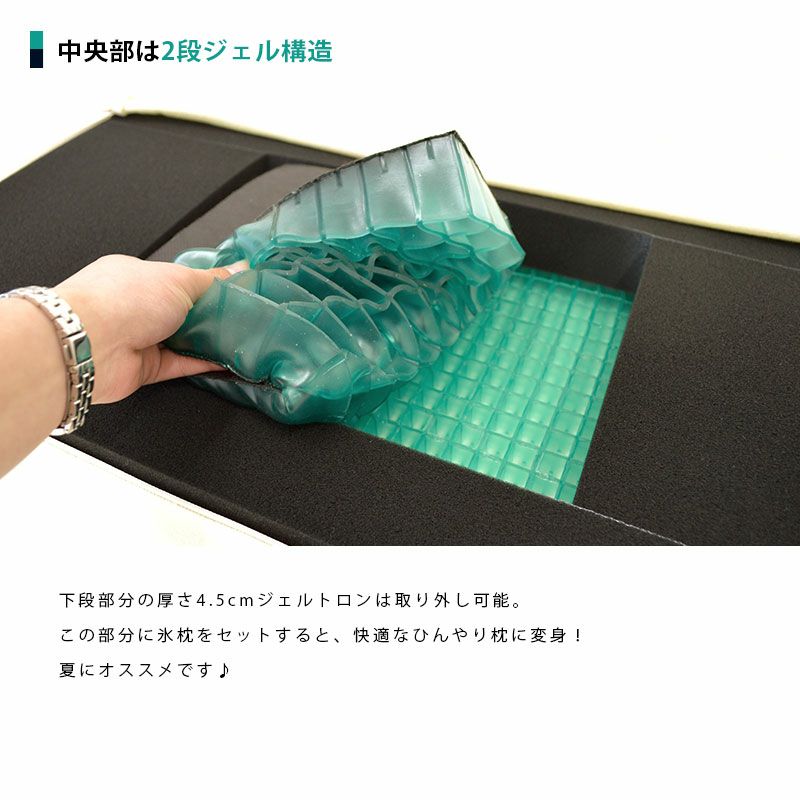 下段部分の厚さ4.5cmジェルトロンは取り外し可能。この部分に氷枕をセットすると、快適ひんやり枕に変身!夏にオススメです♪