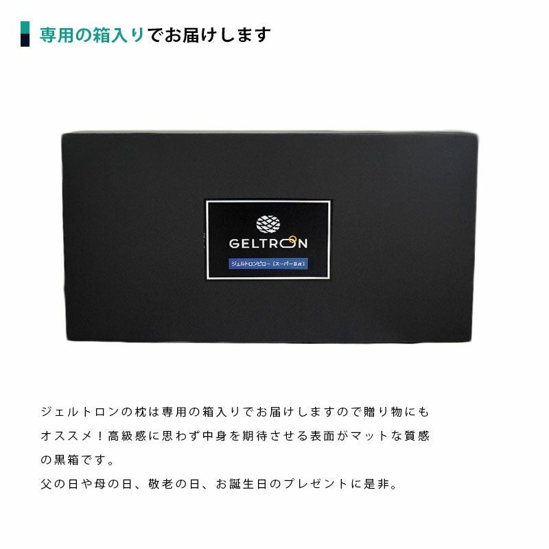 ジェルトロンの枕は専用の箱入りでお届けしますので贈り物にもオススメ!高級感に思わず中身を期待させる表面がマットな質感の黒箱です。 父の日や母の日、敬老の日、お誕生日のプレゼントに是非。