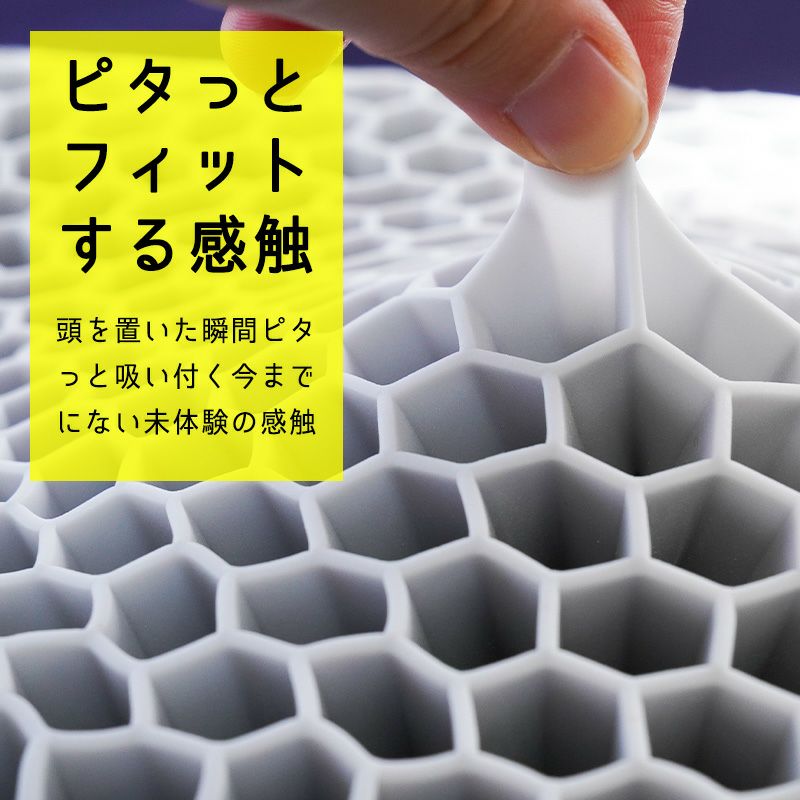 頭を置いた瞬間、ピタッと吸い付いてフィットする今までにない未体験の感触。圧力がかかると素早く跳ね返り、どんな体勢でも頭や首の形状に合わせて柔軟にカタチを変化させます。