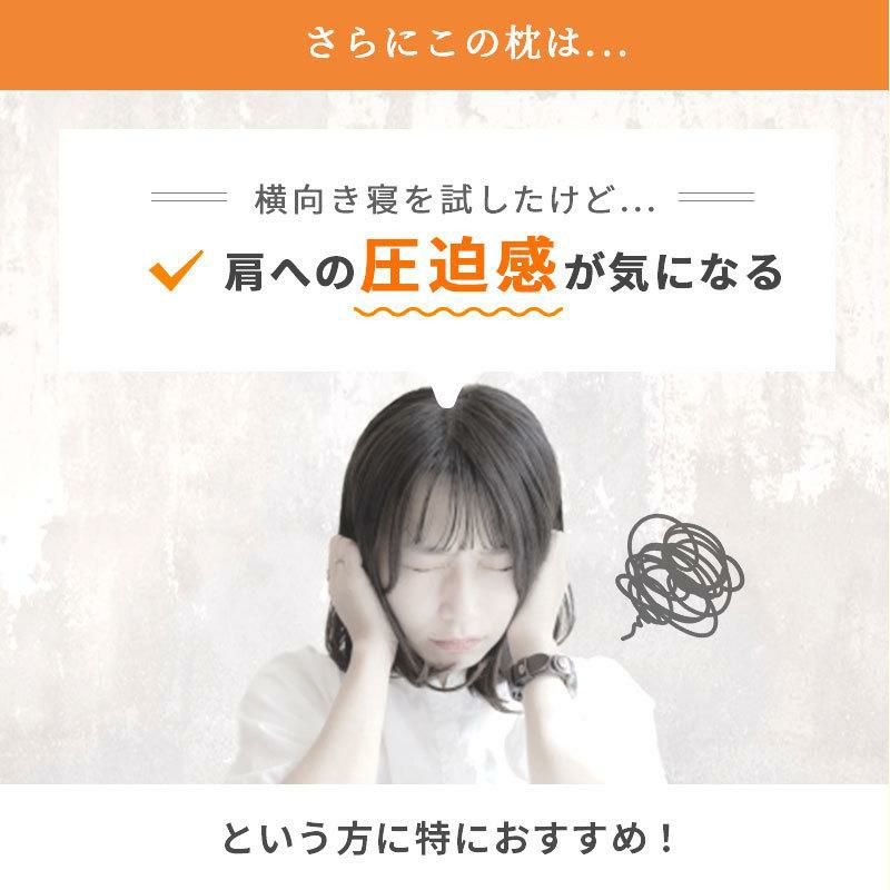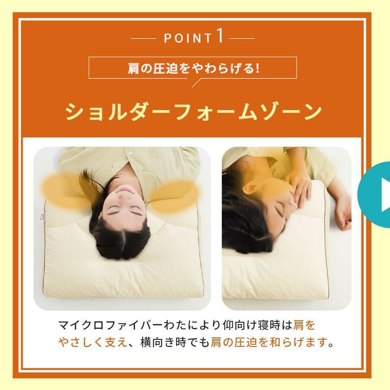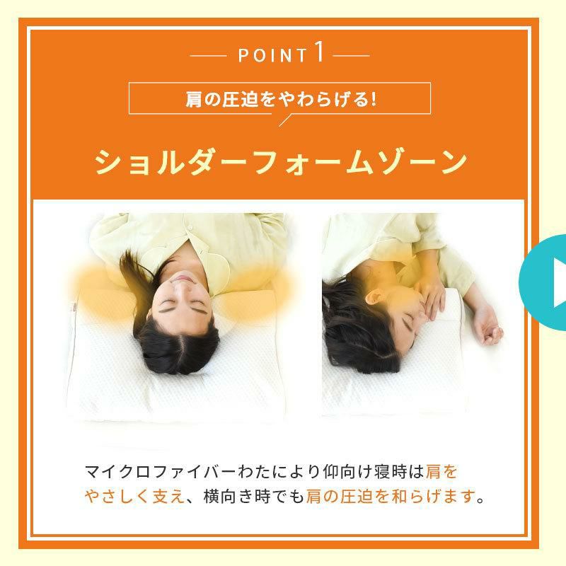 ふっくらとやわらかなわた入りの「ショルダーフォームゾーン」により、仰向け寝時は肩をやさしく支え、横向き寝時でも方への負担を和らげます。