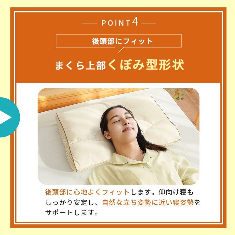 首まくらの上部に凹型形状を配置し、後頭部も心地よくフィットします。仰向け寝もしっかり安定し、自然なたち姿勢に近い寝姿勢になるようサポートします。