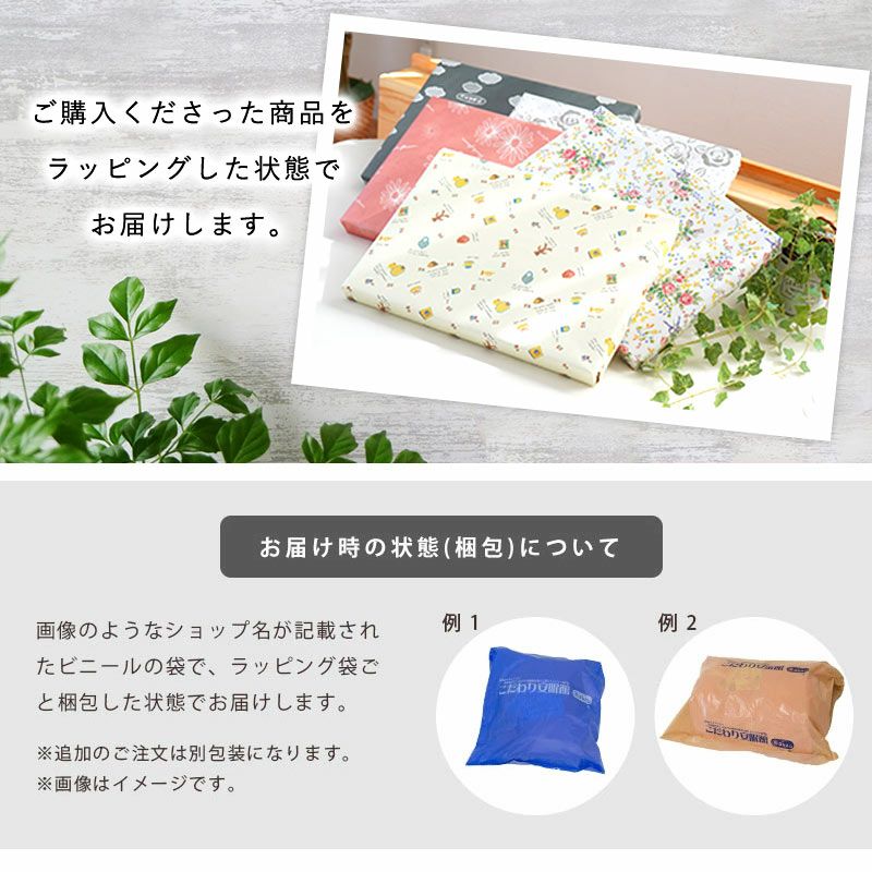 商品の大きさに合わせて、それに見合った箱をご用意いたします。一例:薄手のタオルケットが1枚入るケース、羽毛布団専用ケースなど※パジャマ1枚の場合は、「パジャマ用ギフトケース」の販売もございます。