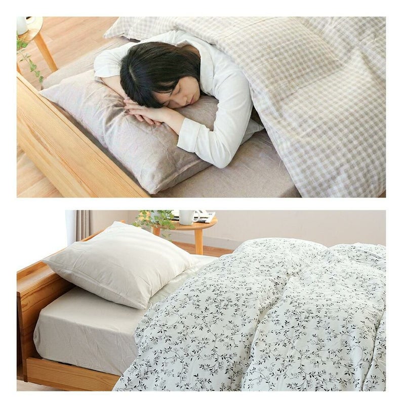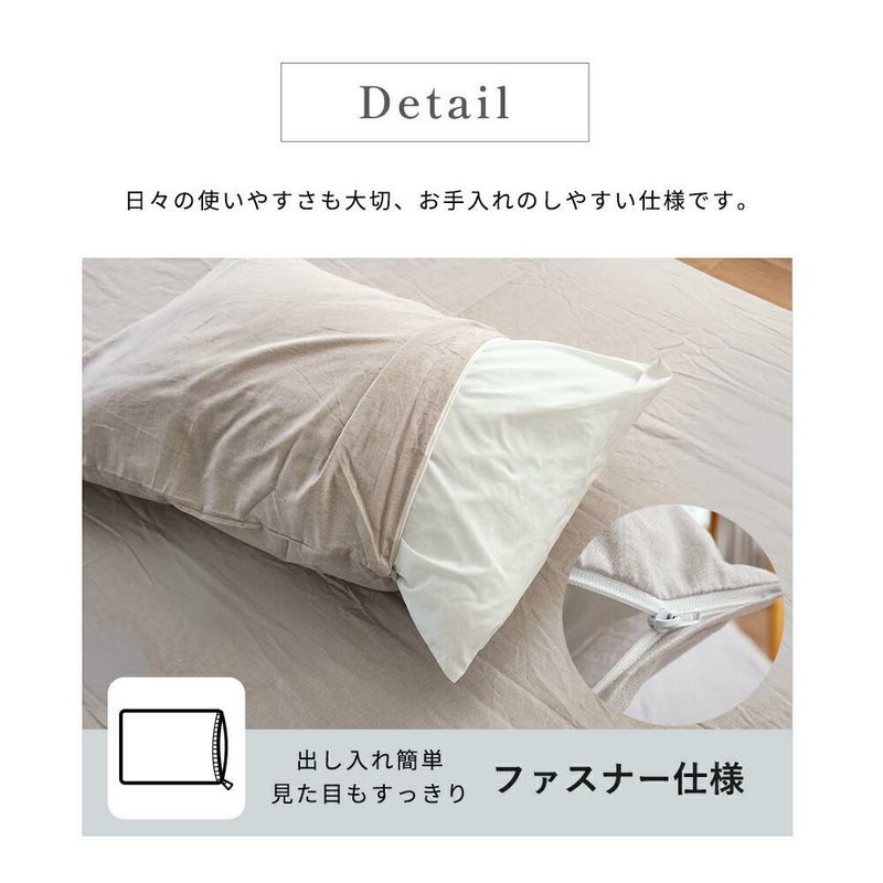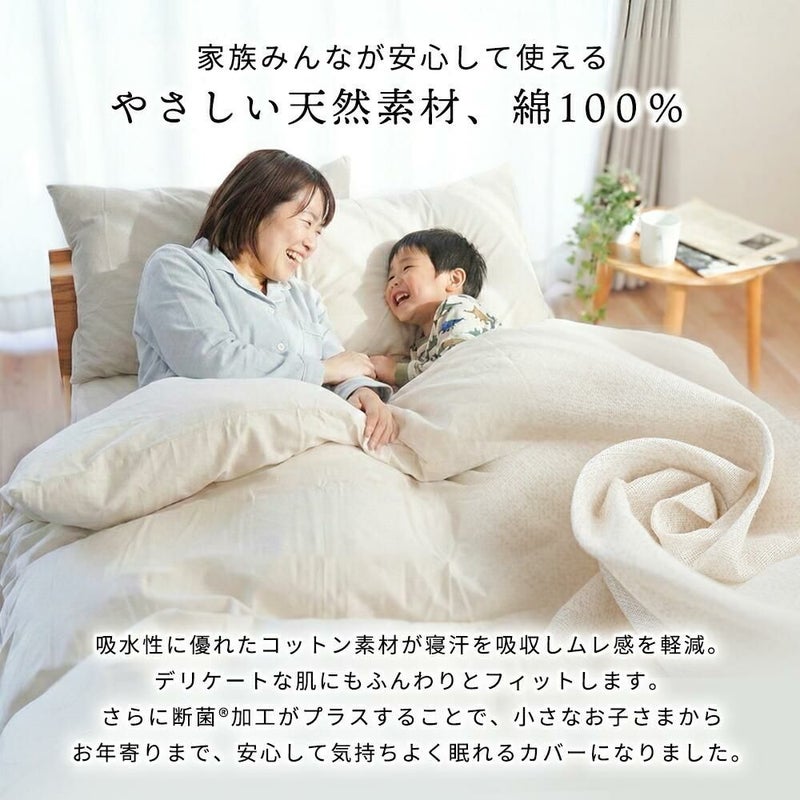 低刺激なコットンを100%使用。吸水性に優れ、寝ている間の汗をやさしく吸収してムレ感を軽減します。ふんわりとした肌触りでデリケートなお肌にもやさしく、小さなお子さまからお年寄りまで、家族みんなが安心して気持ちよく使えるカバーです。
