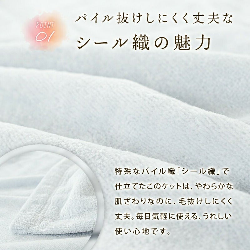特殊なパイル織「シール織」で仕立てたこのケットは、やわらかな肌ざわりなのに、毛抜けしにくく丈夫。毎日気軽に使える、うれしい使い心地です。