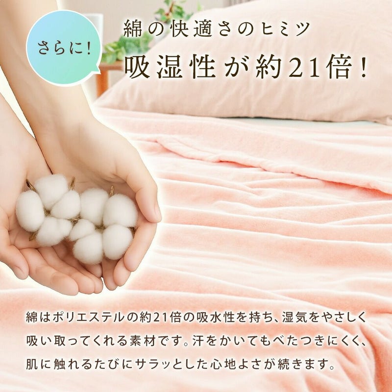 お肌に触れる部分は上質なコットン100%使用。天然繊維の綿は、吸湿性・通気性・保温性に優れ、夏はサラッと冬はふんわり適度な保温力で心地良い仕上がりです。
