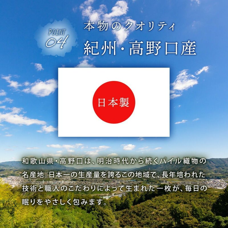 和歌山県・高野口は、明治時代から続くパイル織物の名産地。日本一の生産量を誇るこの地域で、長年培われた技術と職人のこだわりによって生まれた一枚が、毎日の眠りをやさしく包みます。