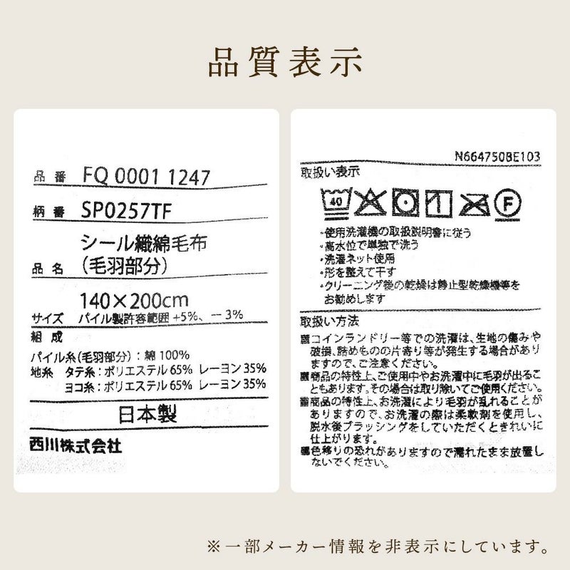 4. 西川 高野口パイル 綿毛布 シングル 綿100% 日本製