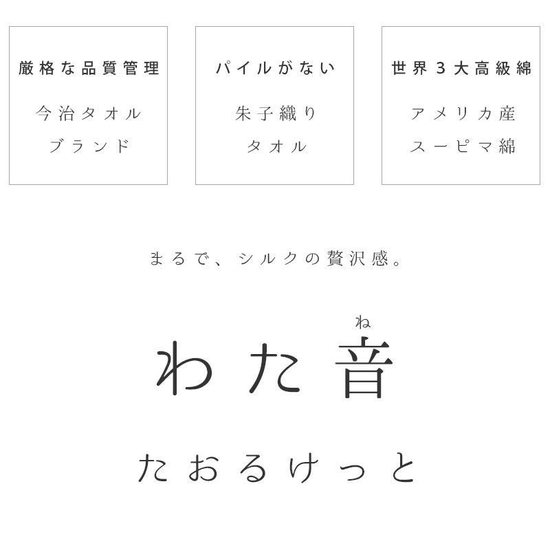 最高クラスのスーピマコットンを使用。繊維が細く長く、耐久性に優れ、さらにしっとりとやわらかい肌触りはカシミヤに匹敵すると言われているほど。独特の光沢も魅力的。「わたを織る」というコンセプトでできた「わた音」。メーカーオリジナルの「糸わた」を丁寧に織り上げた上品な逸品です。