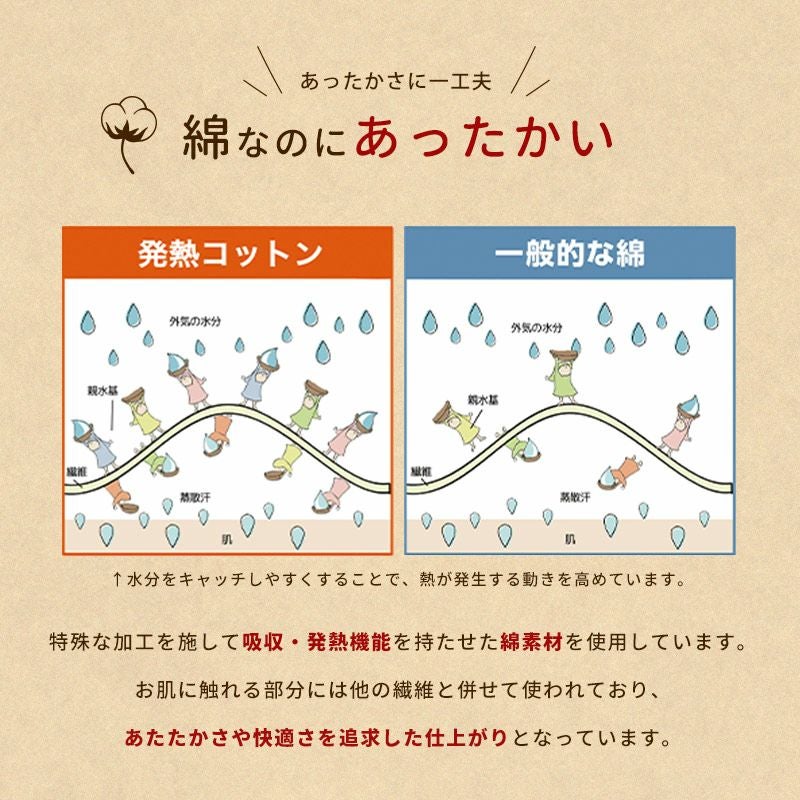 綿に特殊な加工を施し、吸湿・発熱機能を持たせた素材を使用。寝ている間にかいた汗を利用して、熱に変換します。汗を吸収し、暖かい空気に変え、暑すぎない丁度良い暖かさをキープします。