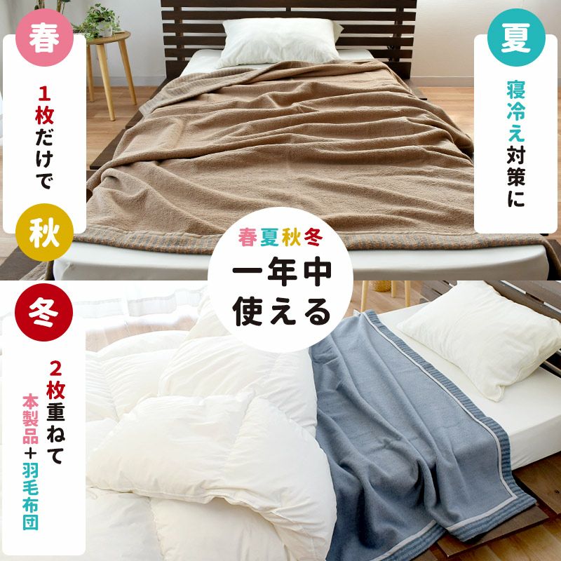 毛布が重くて体に負担が掛かるのにお悩みの方もウォームサポートケットなら冬でも軽々あったかい!薄くて軽くても自然な暖かさをキープしてくれます。春:秋は一枚だけで、夏は寝冷え対策に、冬は羽毛布団との併用で。オールシーズンお使いいただけます。