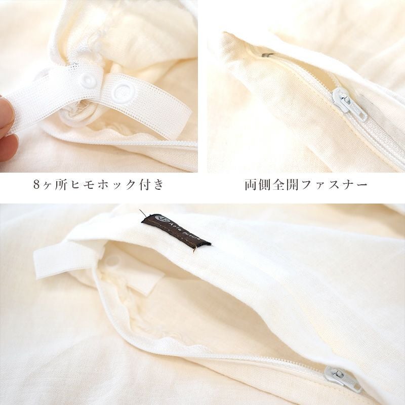 あたたかいお布団とは、身体にしっかりとフィットし、かつ身体に負担を掛けない軽さが重要です。せっかくの軽い羽毛布団でも、重くて固いカバーを掛けてしまうと羽毛が上から押さえつけられて羽毛布団の機能が十分に発揮できません。羽毛布団のキルトにやわらかく寄り添い、ふわりと軽く丈夫なガーゼは、まさに羽毛布団にぴったりのカバーです